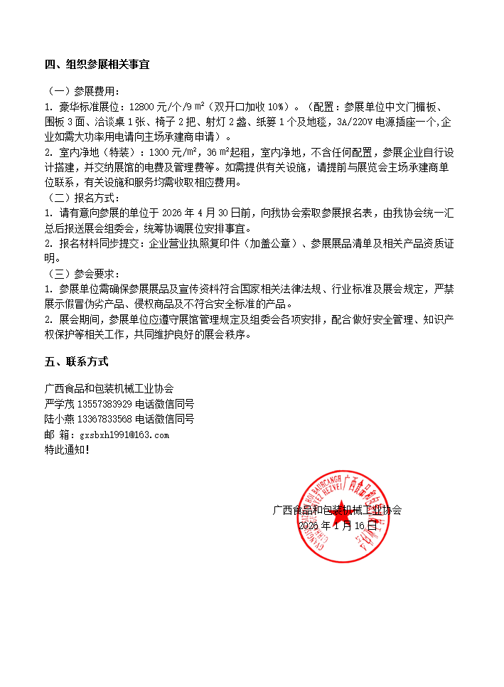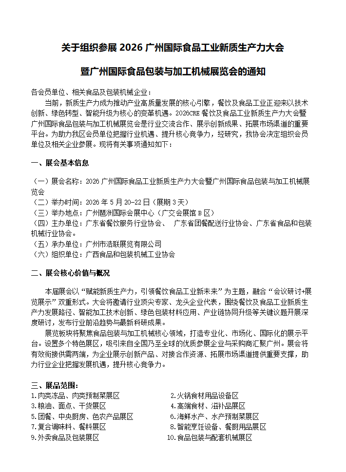 关于组织参展2026广州国际食品工业新质生产力大会 暨广州国际食品包装与加工机械展览会的通知